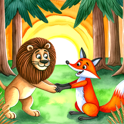 a lion wandering through the forest meets a friend at the end