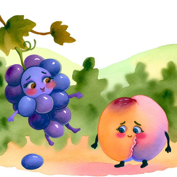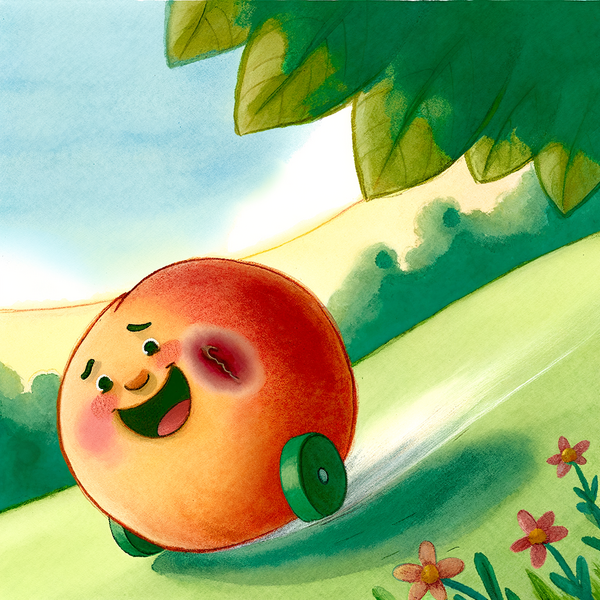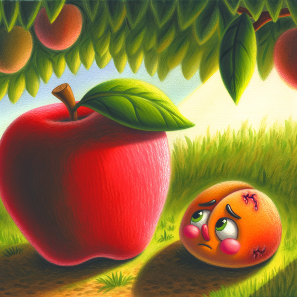 Perry the Peach felt sad about the small bruise on his side. He watched Benny the Apple, who never seemed to bruise. 'Why can't I be tough like Benny?' Perry sighed. Benny overheard and smiled gently. 'Everyone has their soft spots, Perry,' he said kindly.
