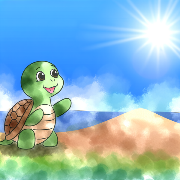 Tommy the tiny turtle tried really hard and finally reached the top of the big, sandy hill.